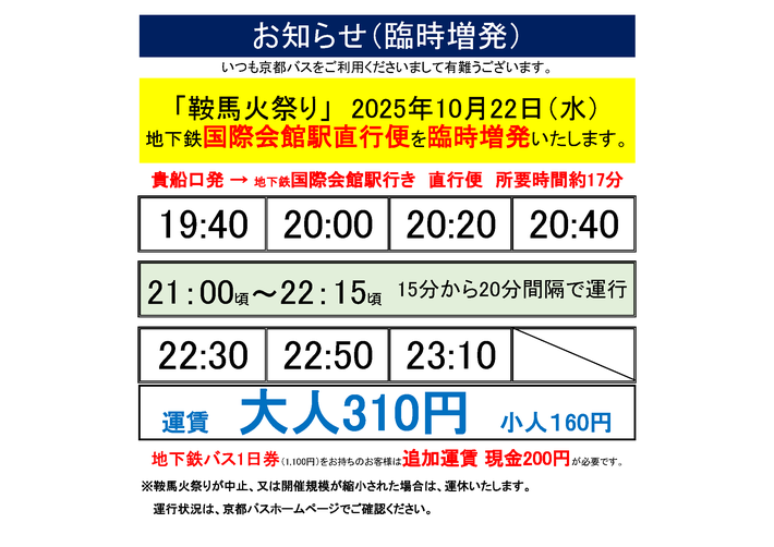 なお、「鞍馬の火祭」が中止される場合や開催規模が縮小された場合、臨時便の運行はございません。
