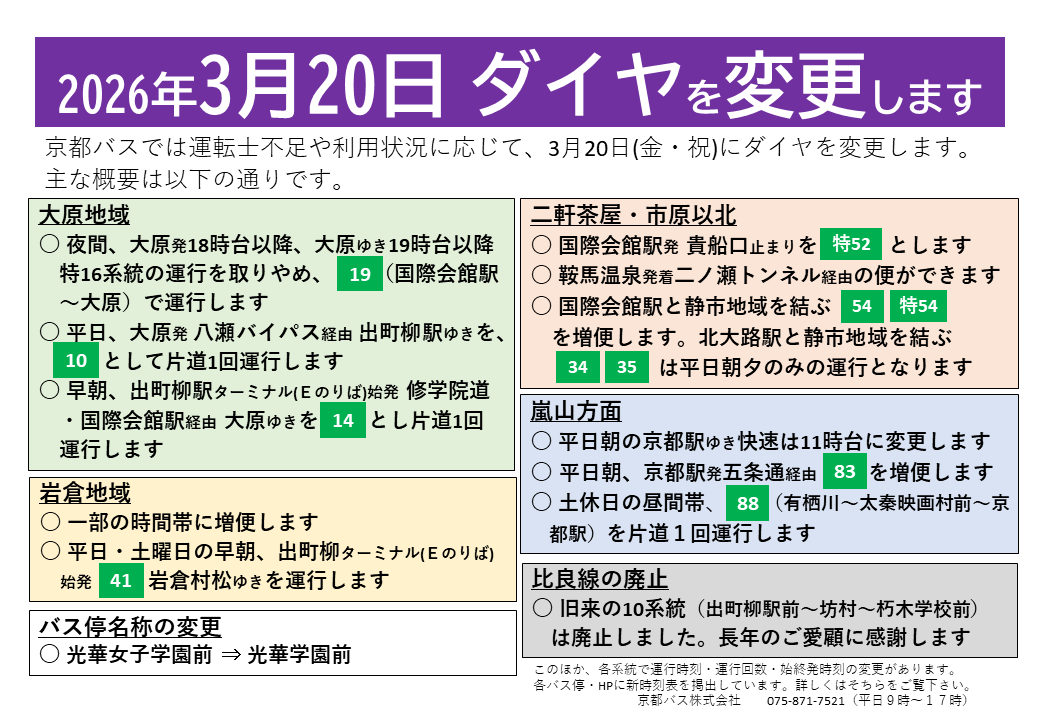 京都バスでは2026年3月20日(金・祝)に、ダイヤ変更を実施いたします。