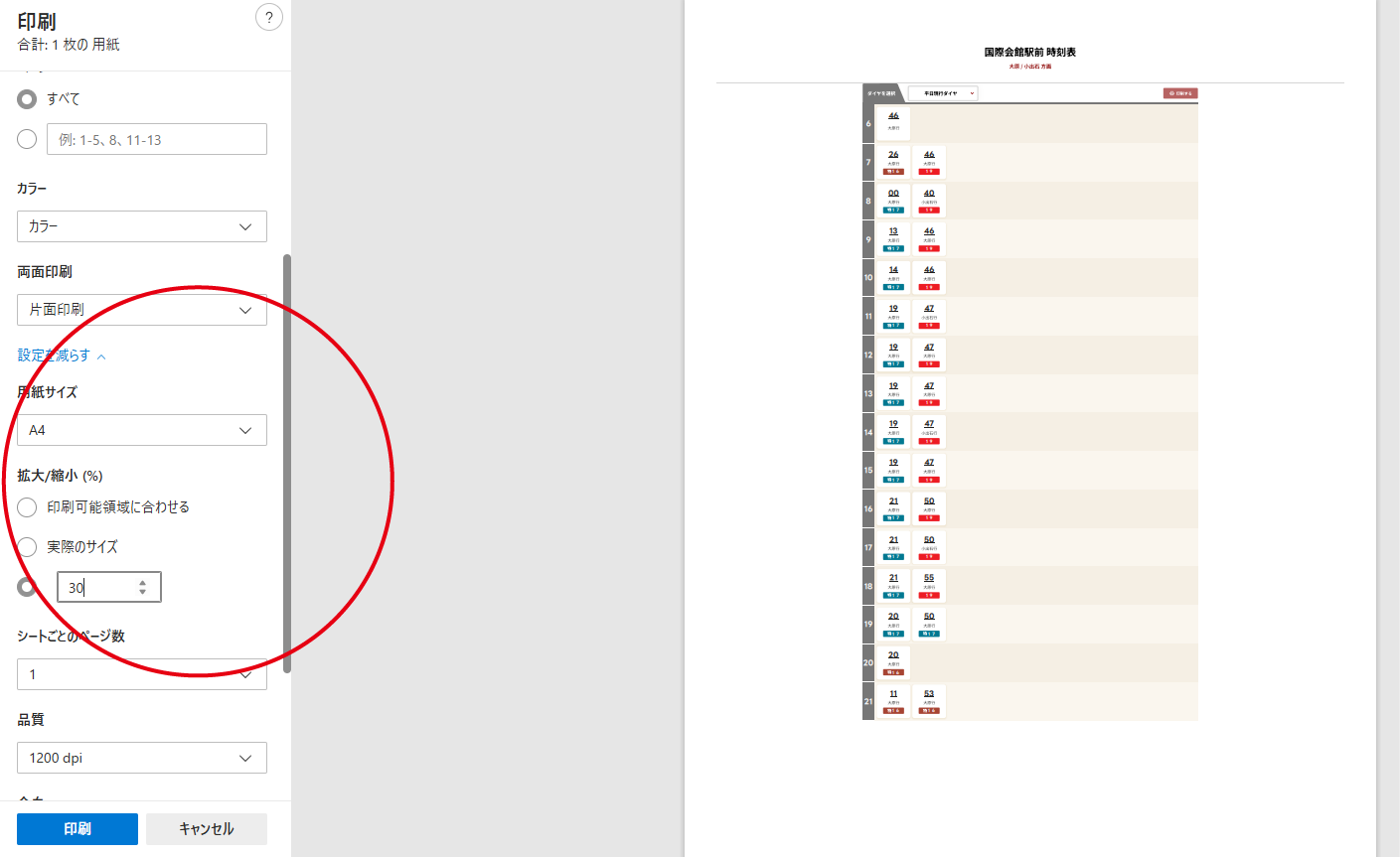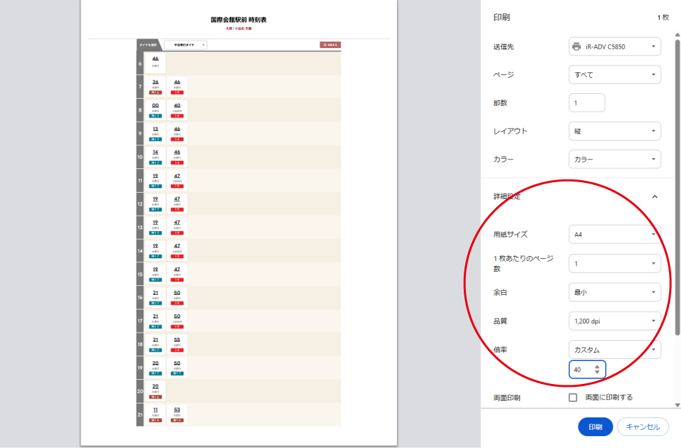 時刻表ページの印刷について